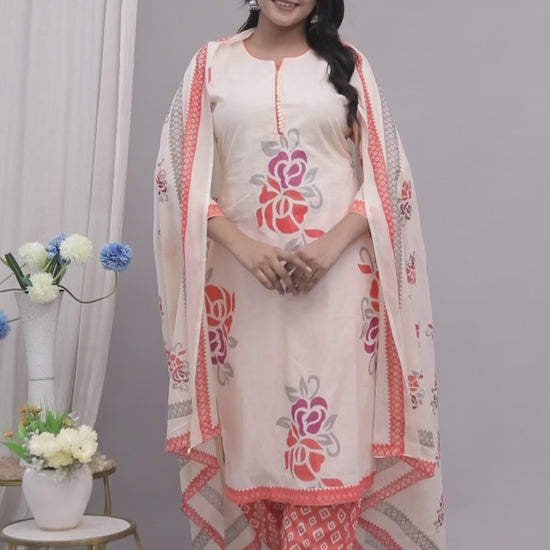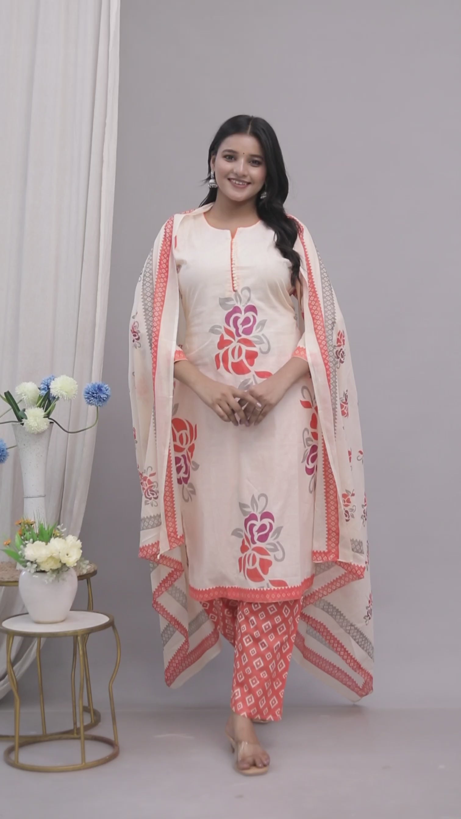 Elevate your ethnic wardrobe with this cotton printed kurta pant with dupatta set in a refreshing blend of orange and cream hues. Crafted from soft, breathable cotton, this set ensures all-day comfort while keeping you stylish. The kurta features elegant prints that add a touch of charm, paired with matching pants for a sleek look. A beautifully coordinated dupatta completes the outfit, making it perfect for casual outings, festive gatherings, or office wear.